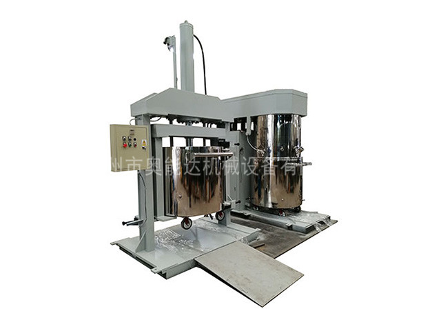 行星架轉(zhuǎn)動時,帶動箱內(nèi)的三根攪拌、分散軸圍繞料桶軸線公轉(zhuǎn)的同時高速自轉(zhuǎn),從而使物料受到強(qiáng)烈的剪切、捏合作用,達(dá)到充分分散和混合的目的;在行星架上有一刮壁刀隨行星架轉(zhuǎn)動,緊貼桶壁不斷的刮拭,使桶壁無滯留料,提高混合效果。攪拌時間的長短根據(jù)物料的屬性的不同由用戶掌握,可通過控制面板調(diào)節(jié)。封蓋及行星攪拌器由雙柱液壓升降,操作平隱、快捷、輕便。
